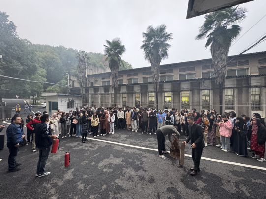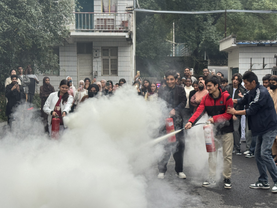随后,校保卫处工作人员现场演示灭火器“提、拔、握、压” 操作流程,讲解火灾报警要点、初期火灾扑救方法及浓烟环境下的自救技巧。留学生代表积极参与实操演练,进一步巩固所学知识。