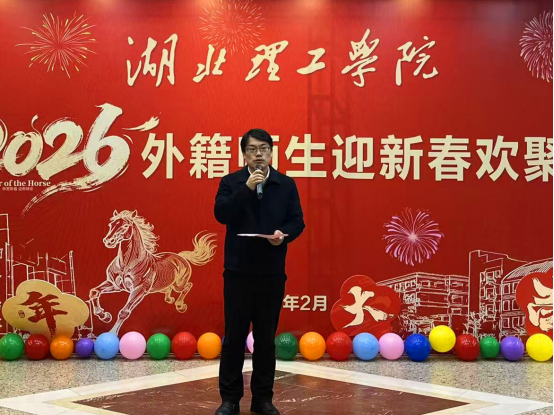 胡国珍校长向全体外籍师生致以诚挚的新春祝福,并回顾了过去一年学校在人才培养、学科建设、科学研究等方面的取得的成绩。他指出,学校始终坚持“开放包容、合作共赢”的理念,致力于为中外师生搭建多元融合、互学互鉴的文化交流平台。希望全体留学生做文化交流的年轻使者,主动拥抱不同文化,将在湖理学习生活的见闻与收获分享给世界,成为联接中外友谊的坚实纽带。在马年新春即将到来之际,祝愿各位在校外籍教师和留学生们身体健康、马年大吉,度过一个欢乐祥和的中国年。
