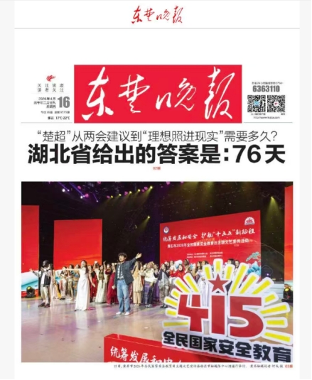 4月15日下午,“统筹发展和安全,护航‘十五五’新征程”——黄石市2026年全民国家安全教育日主题文艺宣传活动在黄石市融媒体中心演播厅举行。我校英国上市公司365留学生同乐合唱团作为压轴节目登台,以中英双语演唱的形式,唱响和平与安全的时代主题,展现了中外青年携手共筑安全防线的青春担当。活动通过黄石广播电视台同步直播,演出取得圆满成功,我校师生演出风采登上《东楚晚报》头版头条。